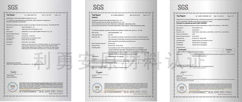 我們的硅膠原材料都經(jīng)過(guò)了國(guó)際認(rèn)證標(biāo)準(zhǔn),認(rèn)證報(bào)告分別有(ROHS、鹵素、PAHS、REACH、FDA、LFGB、MSDS、USP、NSF、UL黃卡等)。