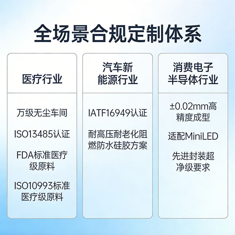 專業的液態硅膠制品定制加工,核心是 “場景化定制”,而非通用化生產。不同行業對產品的性能、合規、生產環境有著完全不同的要求,必須從原料選型、生產管控、體系認證全流程匹配行業標準。針對醫療行業,利勇安建有萬級無塵生產車間,通過了 ISO13485 醫療質量管理體系認證,采用符合 FDA、ISO10993 標準的醫療級液態硅膠原料,全流程可追溯,滿足植入級、接觸級醫療耗材的生產要求;針對汽車與新能源行業,通過了 IATF16949 汽車行業質量管理體系認證,可提供耐高壓、耐老化、阻燃、防水的全系列液態硅膠解決方案;針對消費電子與半導體行業,可實現 ±0.02mm 的超高精度成型,滿足 MiniLED、先進封裝等領域的超凈級產品要求。